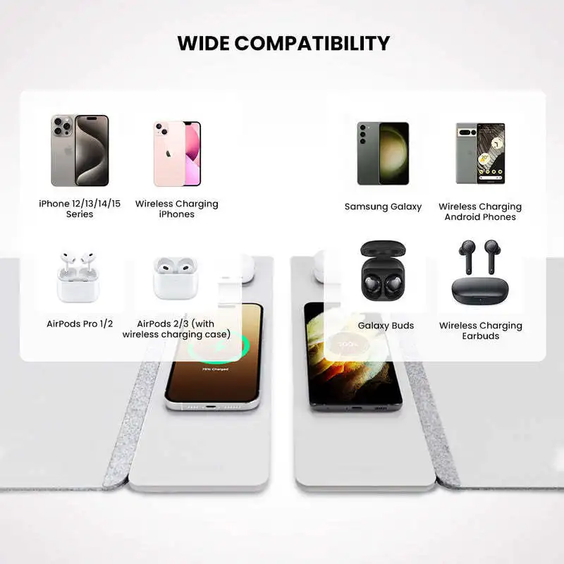 The pad features a standard Qi wireless charger, compatible with all Qi-enabled smartphones including iPhone 8 and newer, Samsung Galaxy series, Google Pixel, and other Qi-compatible accessories like wireless earbuds.